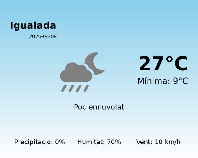 En resum, el dia d’avui a Igualada es presenta com una jornada excel·lent per gaudir de l’aire lliure, amb temperatures agradables i pocs núvols que amenitzaran els moments sota el sol.