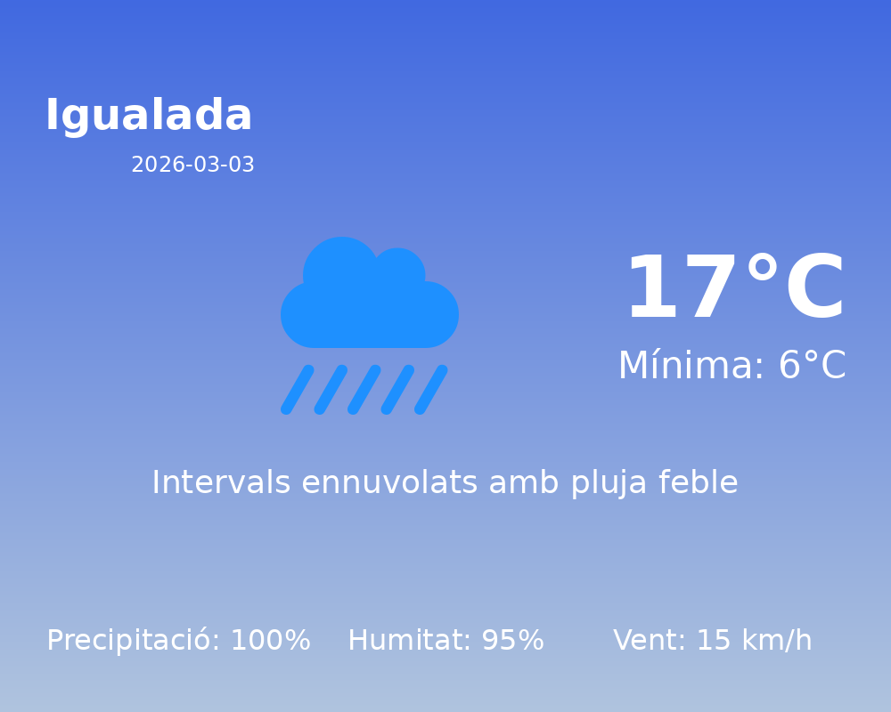 Avui, Igualada experimentarà un dia amb condicions meteorològiques força humides i plujoses. És important tenir en compte les condicions atmosfèriques per planificar les activitats diàries. A continuació, us oferim un detall de la previsió del temps per a la jornada: