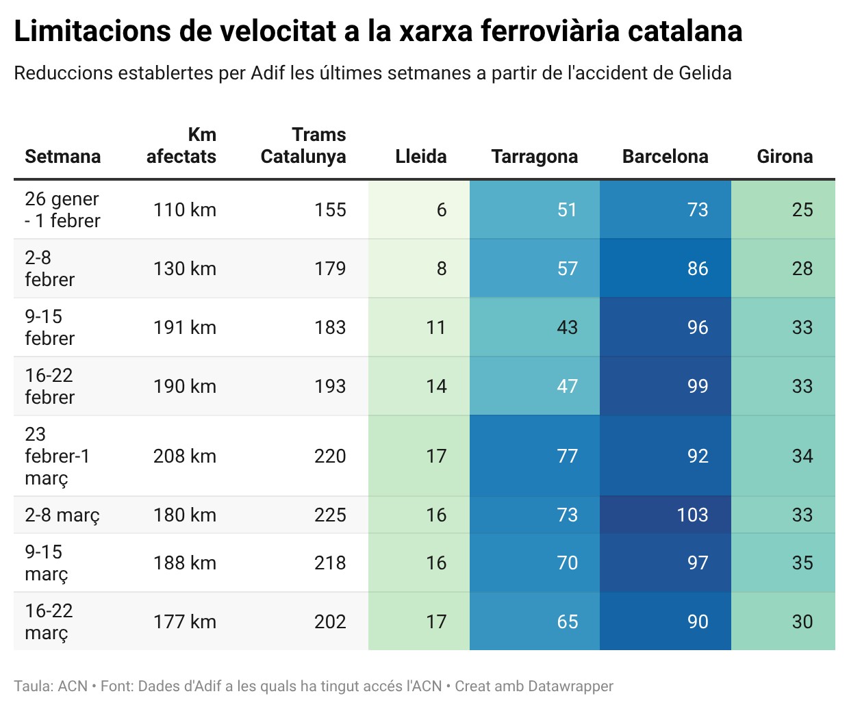ACN Tarragona – La xarxa ferroviària catalana sumarà la quarta setmana consecutiva amb més de 200 trams amb limitacions temporals de velocitat, segons es desprèn del Document Setmanal de Limitacions Temporals de Velocitat que elabora Adif i al qual ha tingut accés l’ACN. En concret, la setmana vinent n’hi haurà 202, setze menys que aquesta setmana, i afectaran un total de 176,8 quilòmetres al llarg de la xarxa, uns deu menys que aquests darrers dies. Entre les novetats hi ha que l’administrador ferroviari ha aixecat quasi totes les restriccions en el tram entre Maçanet-Massanes i Blanes (R1 i RG1), i tan sols n’ha deixat una de 2 quilòmetres per on els trens hauran de circular a un màxim de 70 km/h.