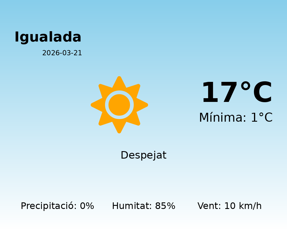 En resum, la jornada a Igualada promet ser agradable i estable, amb cels mostly clars, una temperatura confortable a migdia i un lleuger vent que refrescarà l’ambient. És el dia perfecte per sortir a gaudir del bon temps.